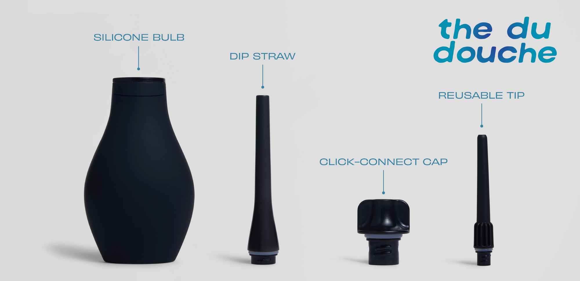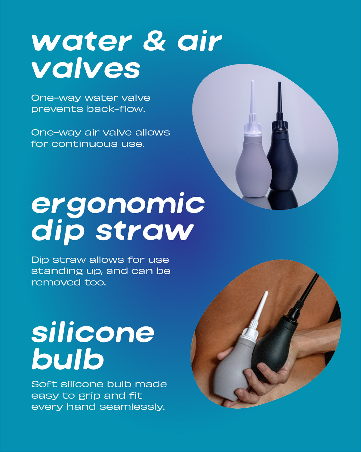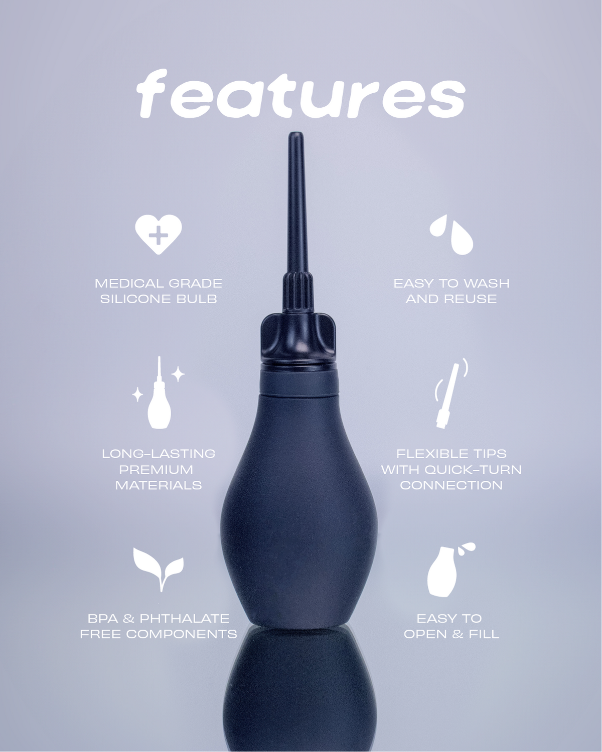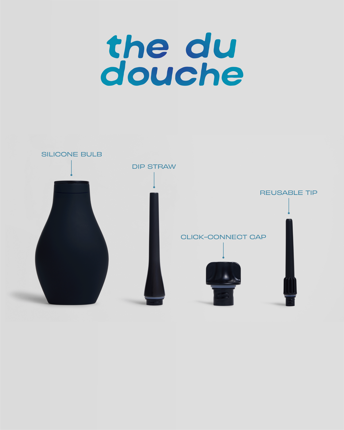 Du Douche is the premium douching experience, designed for effortless functionality and usability. An easily removable cap and wide opening are made with quick filling and cleaning in mind. The FDA-grade silicone bulb fits every hand seamlessly and is ideal capacity to prevent over douching. Our soft tips ensure a hygienic use and feature a quick-turn connection. Included air/water valves prevent back-flow and allow for uninterrupted use of all the water without having to remove and reinsert. An exceptional experience thoughtfully designed with every user in mind.