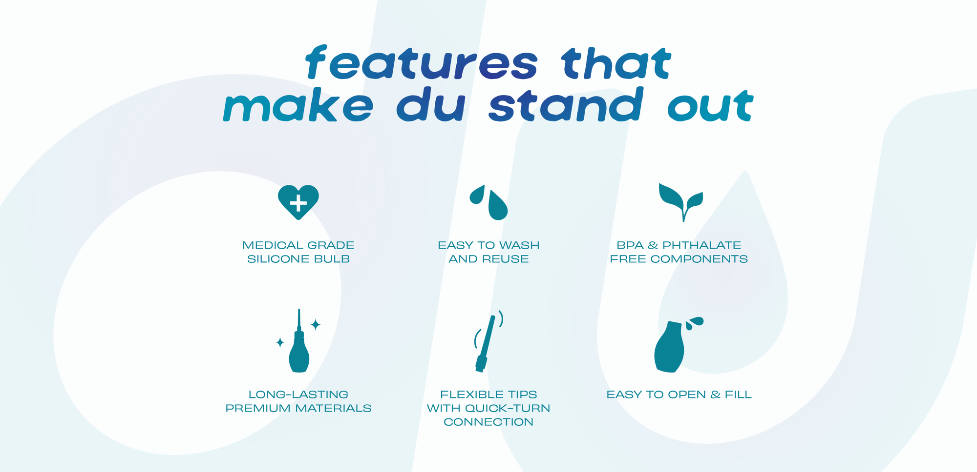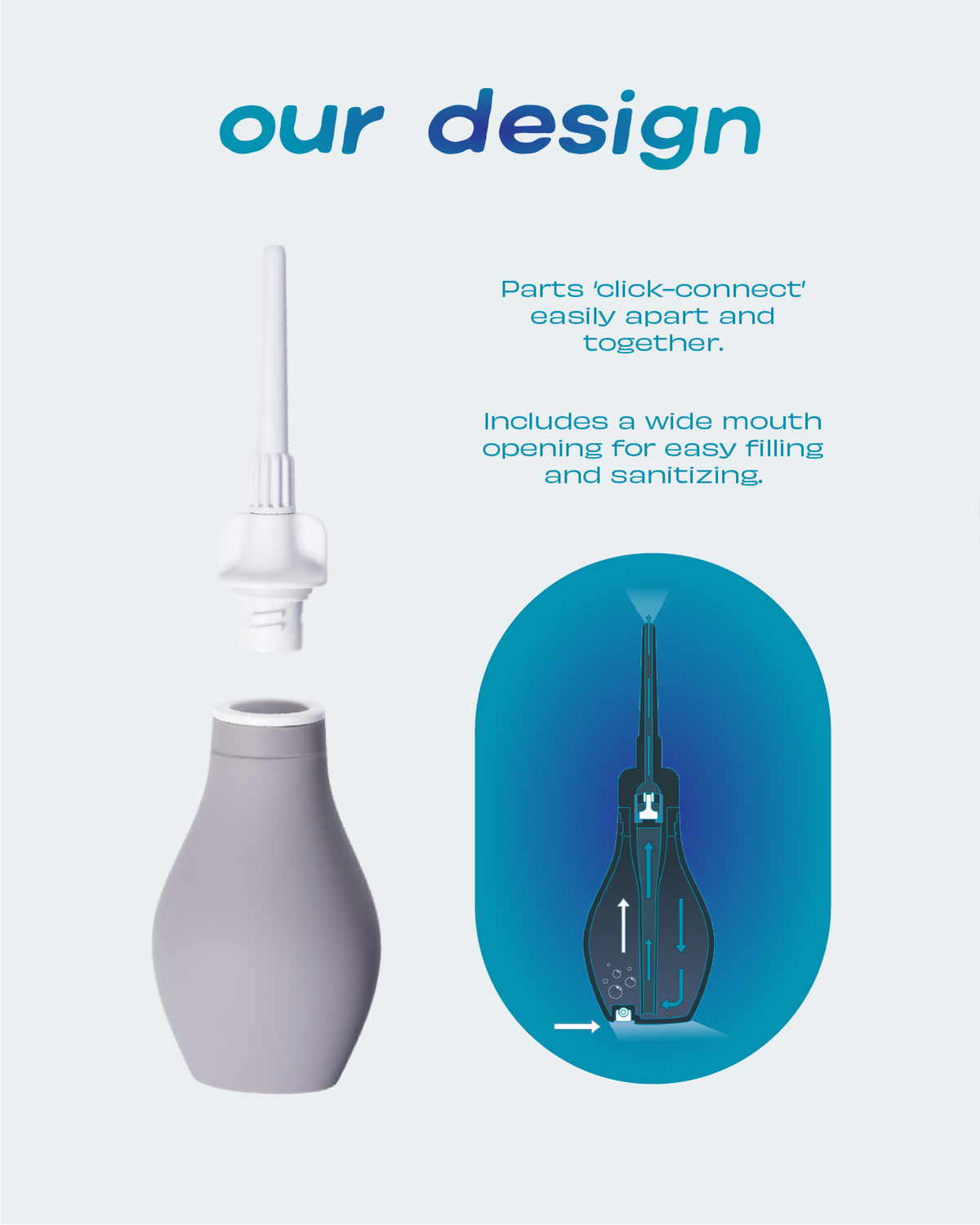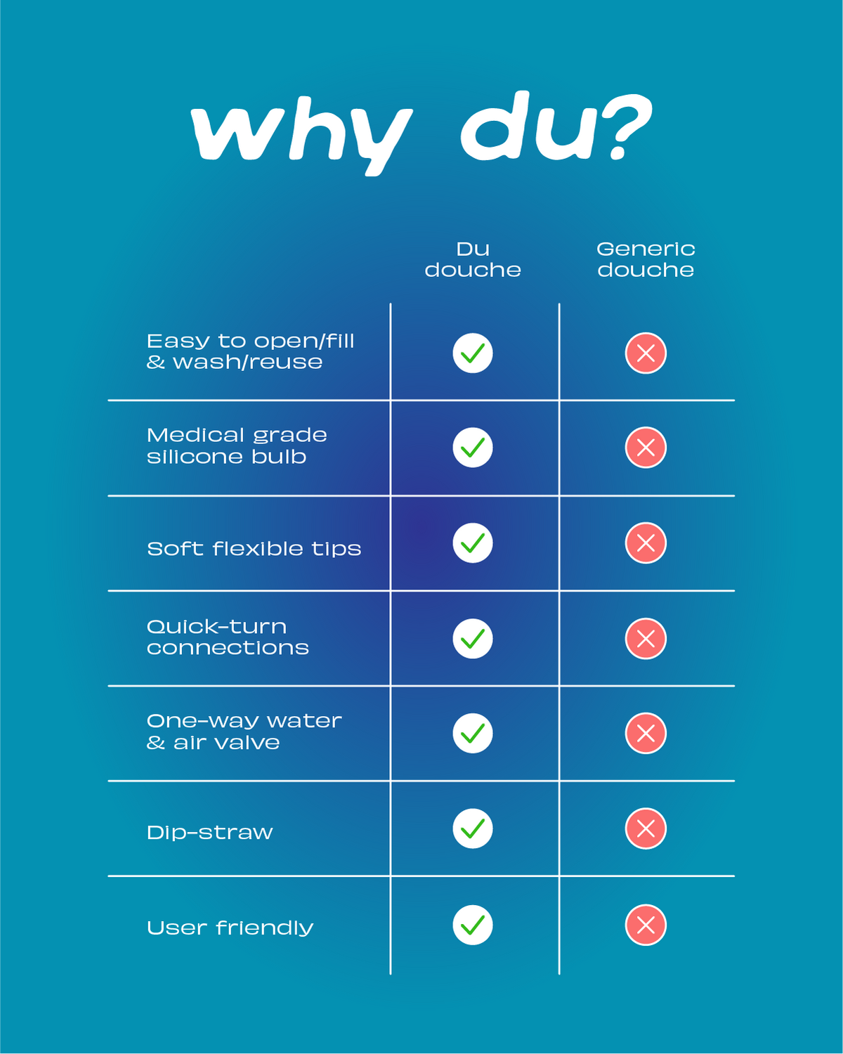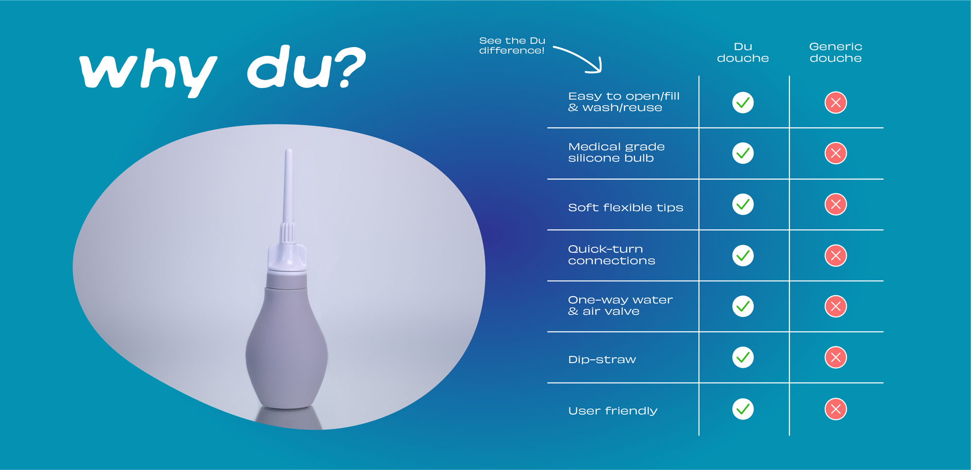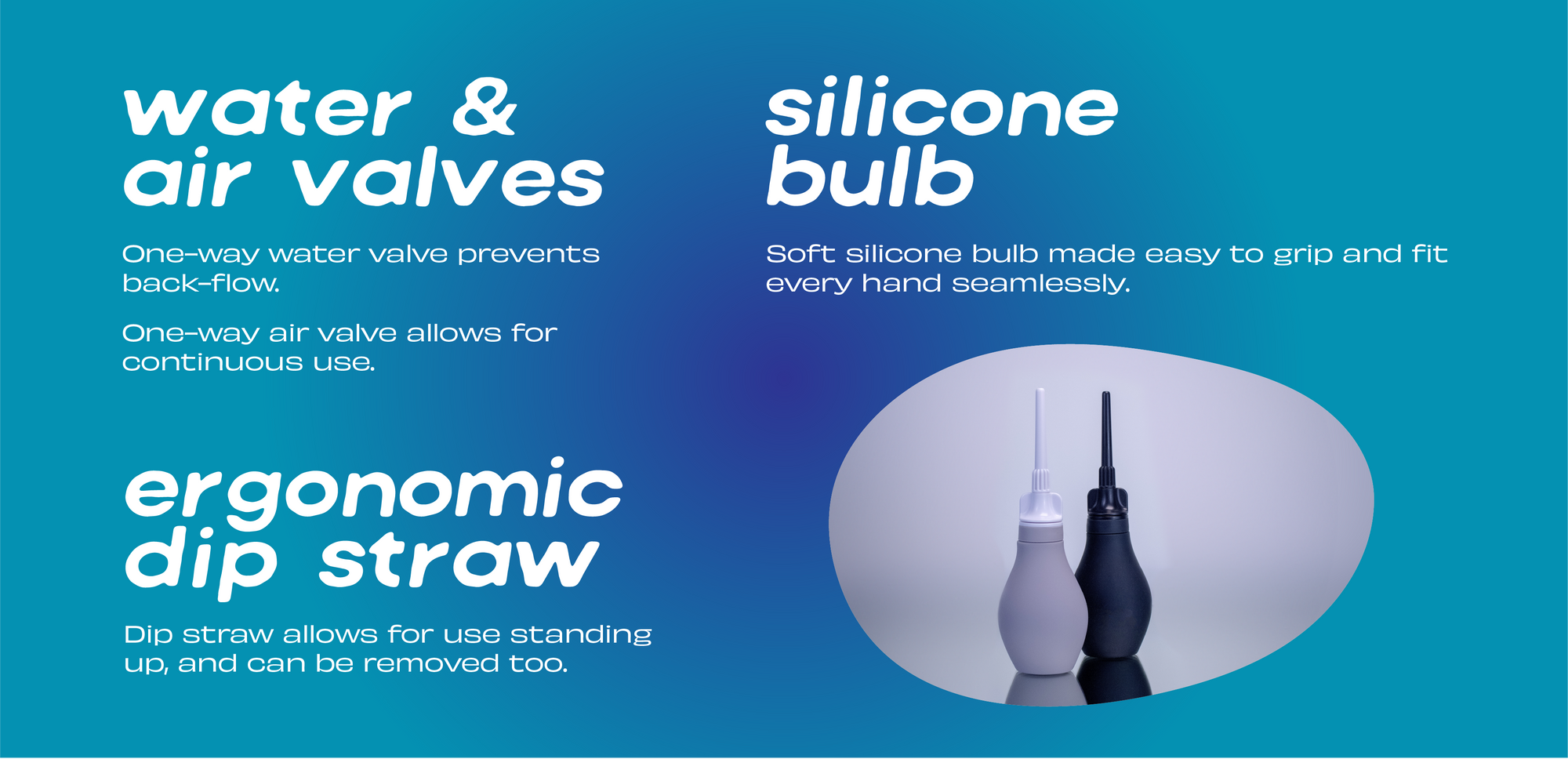 Du Douche is the premium douching experience, designed for effortless functionality and usability. An easily removable cap and wide opening are made with quick filling and cleaning in mind. The FDA-grade silicone bulb fits every hand seamlessly and is ideal capacity to prevent over douching. Our soft tips ensure a hygienic use and feature a quick-turn connection. Included air/water valves prevent back-flow and allow for uninterrupted use of all the water without having to remove and reinsert. An exceptional experience thoughtfully designed with every user in mind.