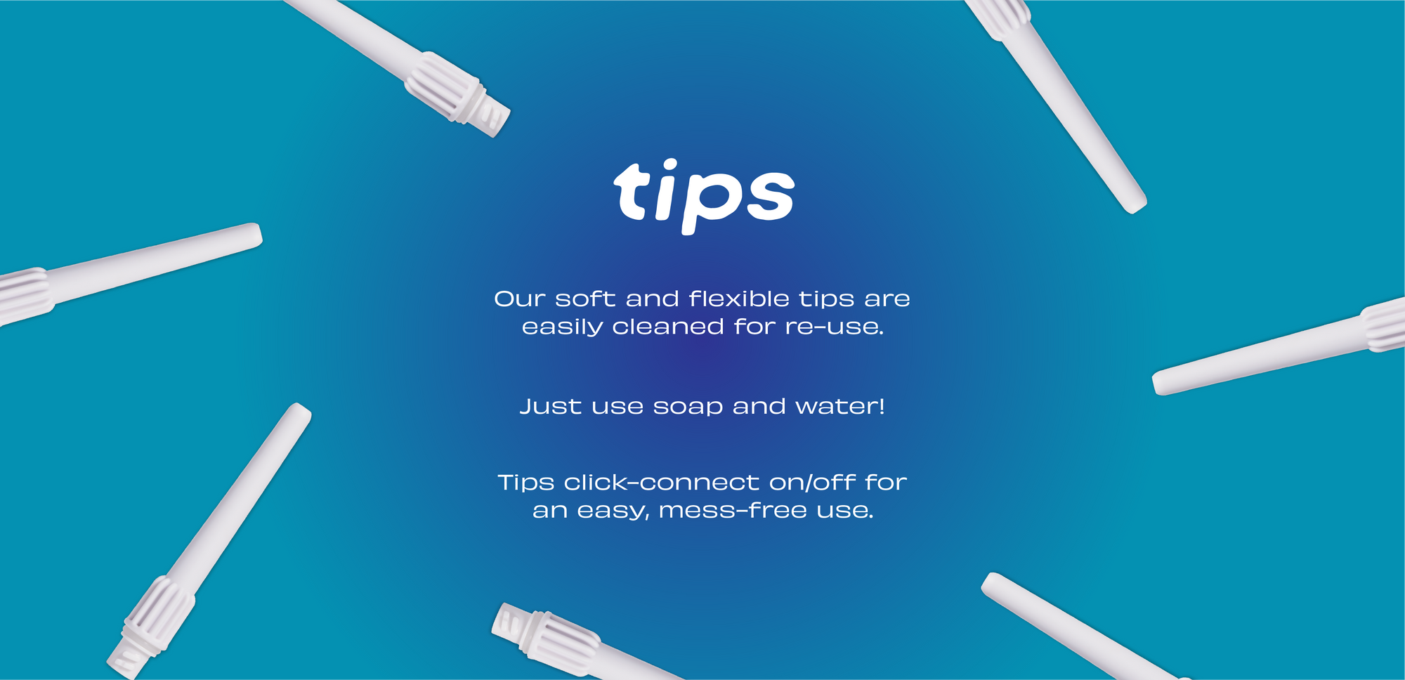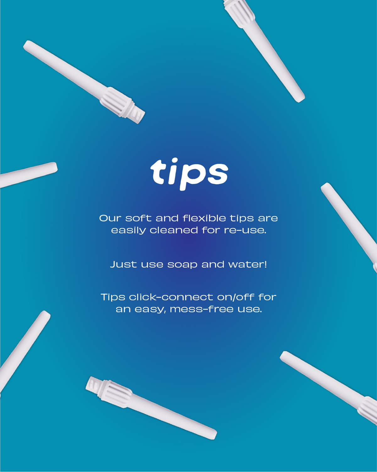 Upgraded Tip - Soft flexible tip are easy to remove and replace with a quick-turn connection. Simply wash & reuse!