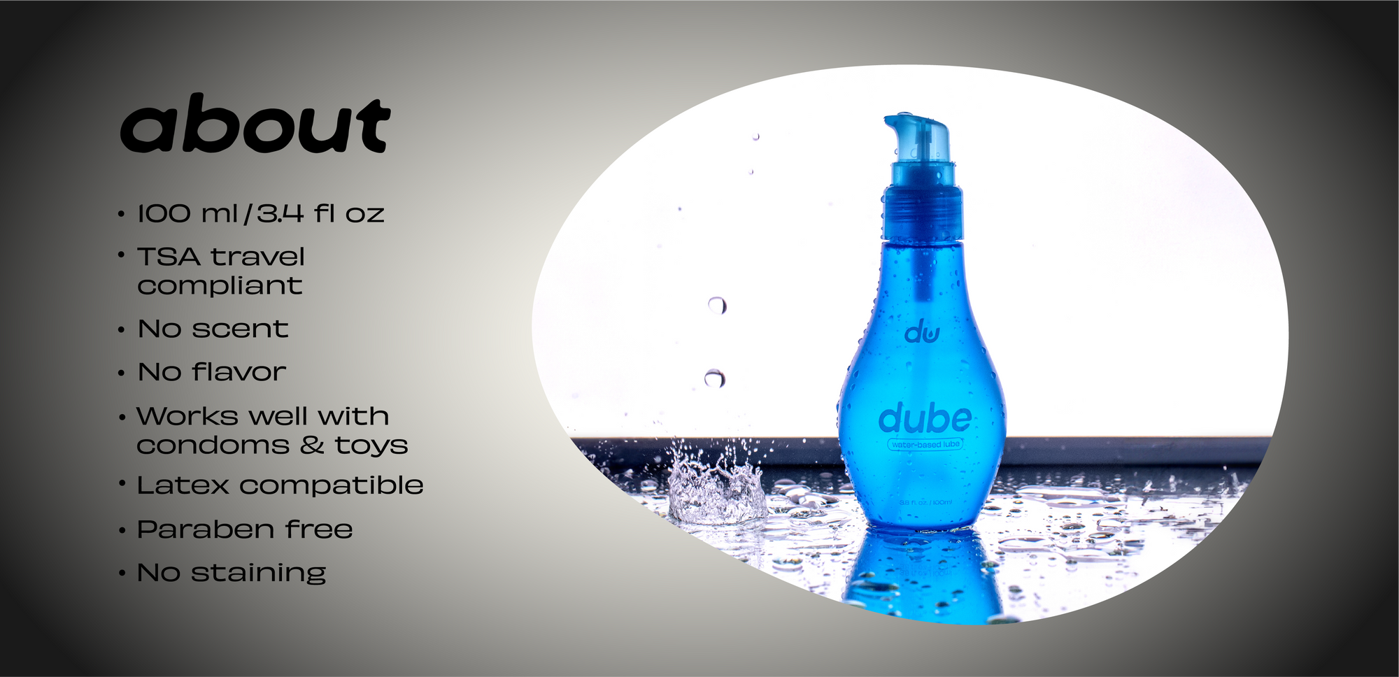 Experience the premium water-based lubricant, 'Dube'. Created for use with Du Douche, toys, and play! Easy to clean up and safe for use, Dube has no scent and doesn't stain.